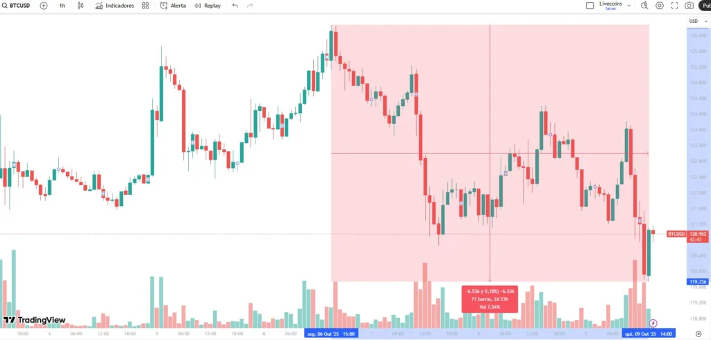 O Bitcoin (BTC) caiu cerca de 5% nesta quinta-feira (9), após atingir um recorde histórico de US$ 126.200 no domingo (5). Atualmente, a criptomoeda é negociada próxima aos US$ 120.000, testando um importante nível de suporte.